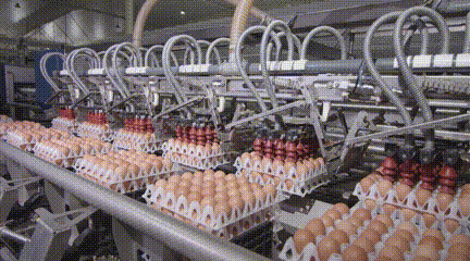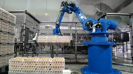 唯有上述各個(gè)環(huán)節(jié)全部通過智能化設(shè)備的檢測并且合格的雞蛋,才能最終得以分裝。當(dāng)然,分裝的過程依然不需要人工參與,從裝入托盤,到放置箱內(nèi),到進(jìn)行封口、整齊碼垛,全部由機(jī)器人完成。