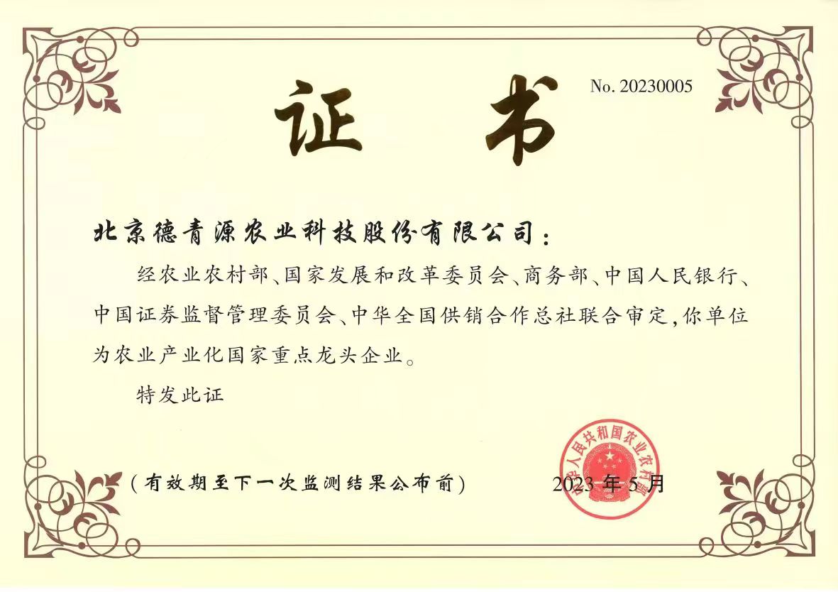 近日,經(jīng)農(nóng)業(yè)農(nóng)村部、國家發(fā)展和改革委員會、商務(wù)部、中國人民銀行、中國證券監(jiān)督管理委員會、中華全國供銷合作總社聯(lián)合審定,北京德青源農(nóng)業(yè)科技股份有限公司再次被認(rèn)定為農(nóng)業(yè)產(chǎn)業(yè)化國家重點(diǎn)龍頭企業(yè)。這是自2007年起,德青源第8次獲得此項(xiàng)殊榮。